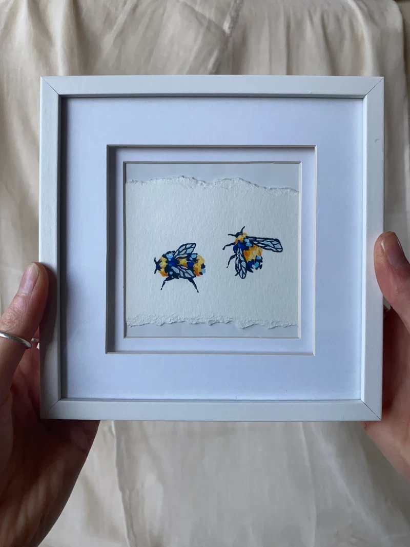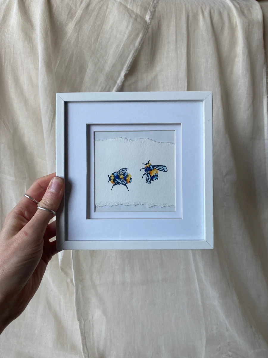 Original gouache bumblebee painting framed in a simple grey frame.