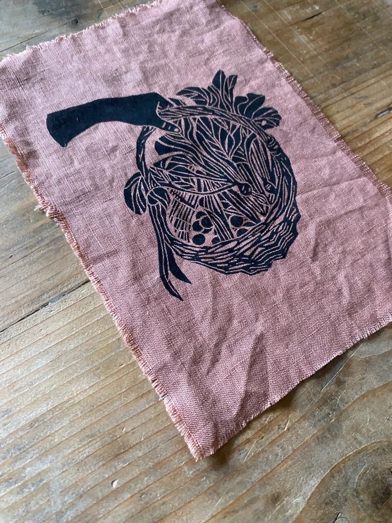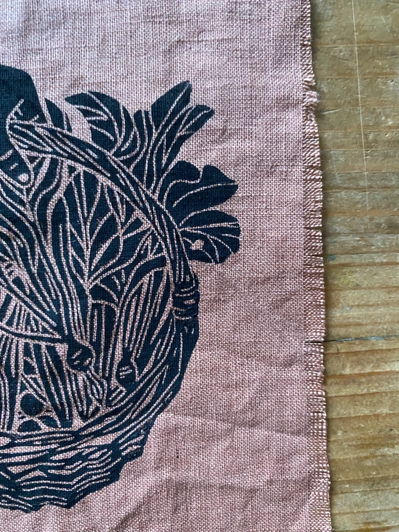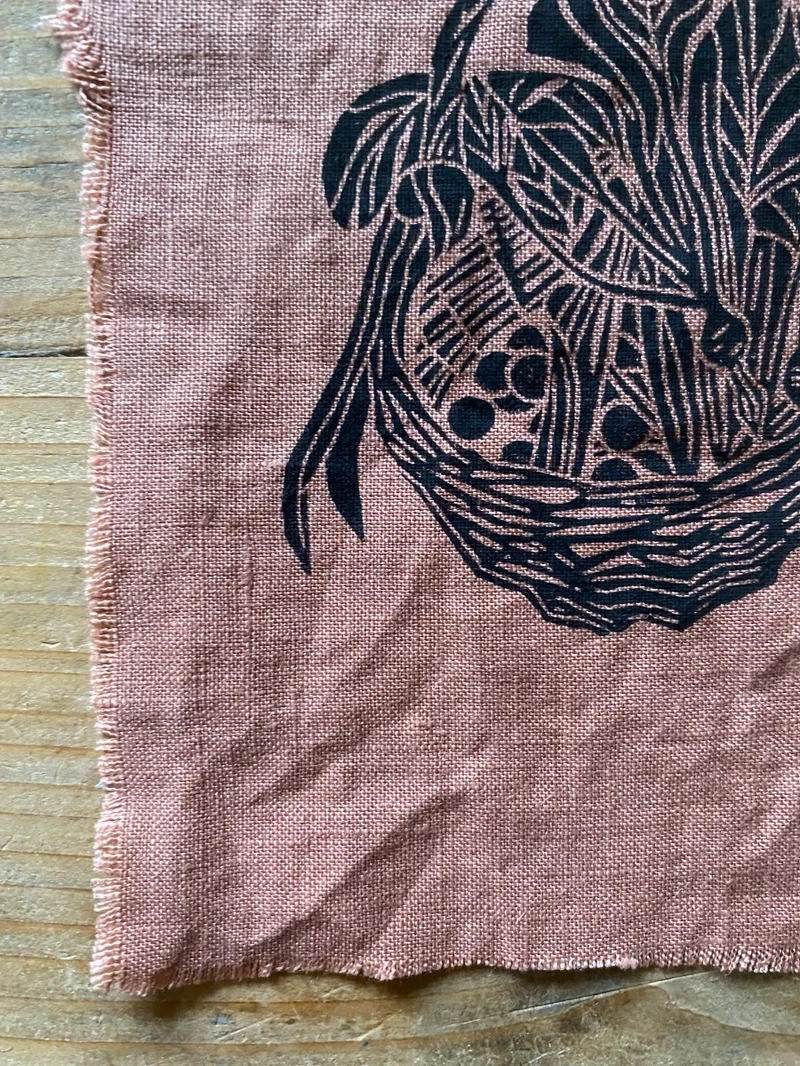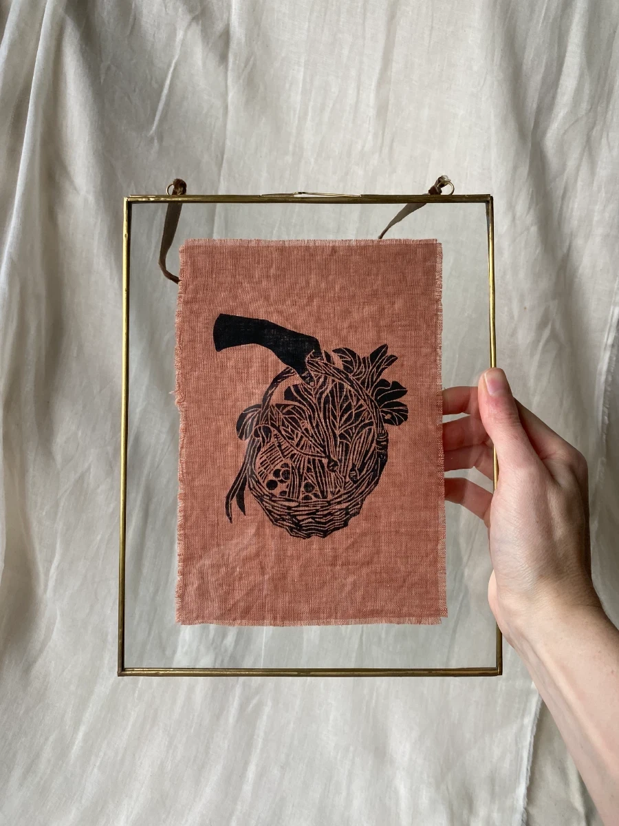 Original lino print on pink clay linen, framed in a glass and brass hanging frame, with velvet twine.