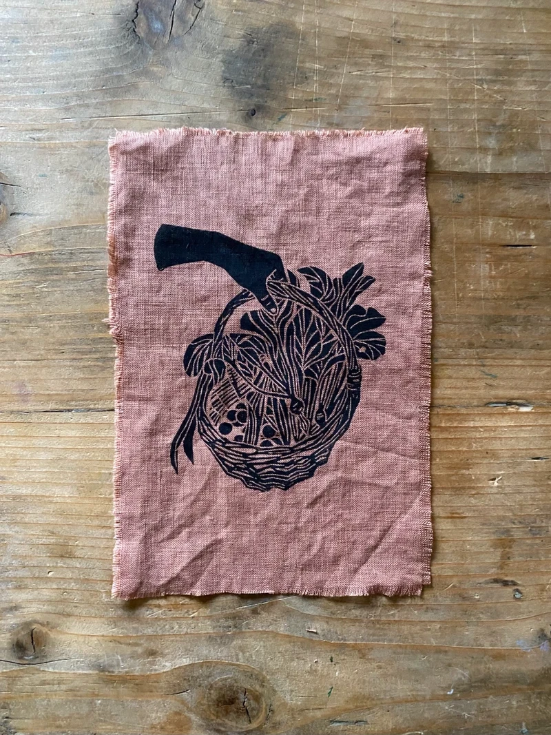 Basket Lino Print on Fabric Framed