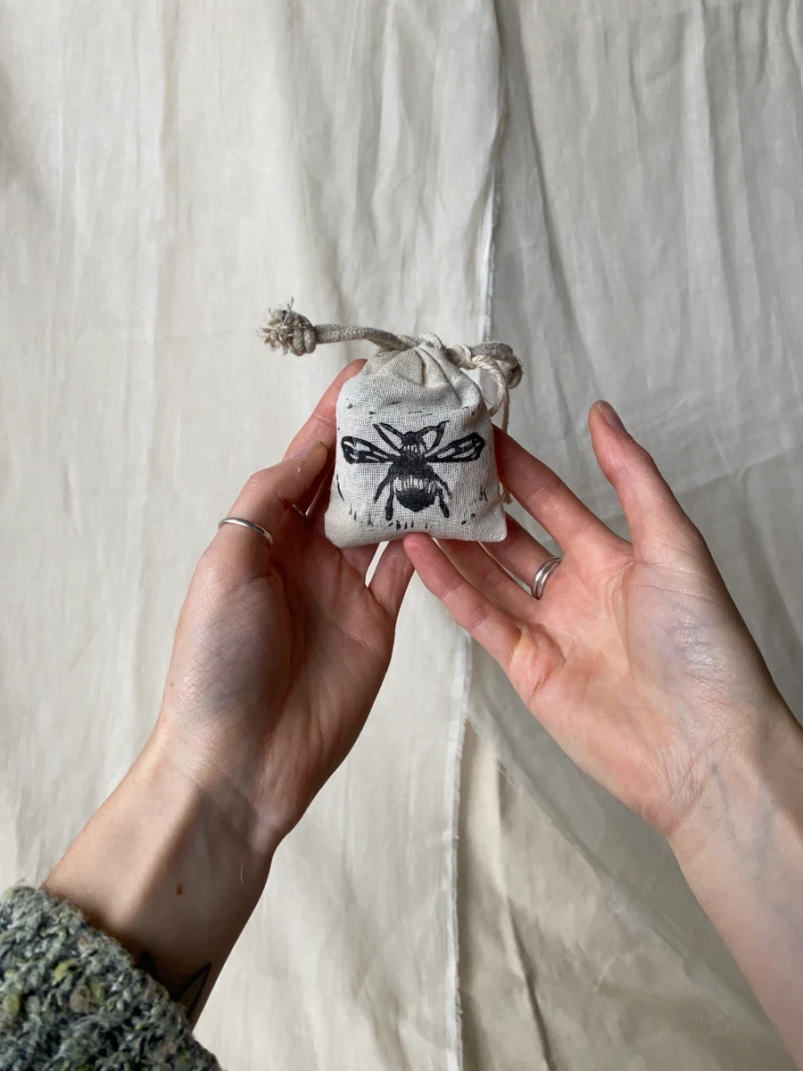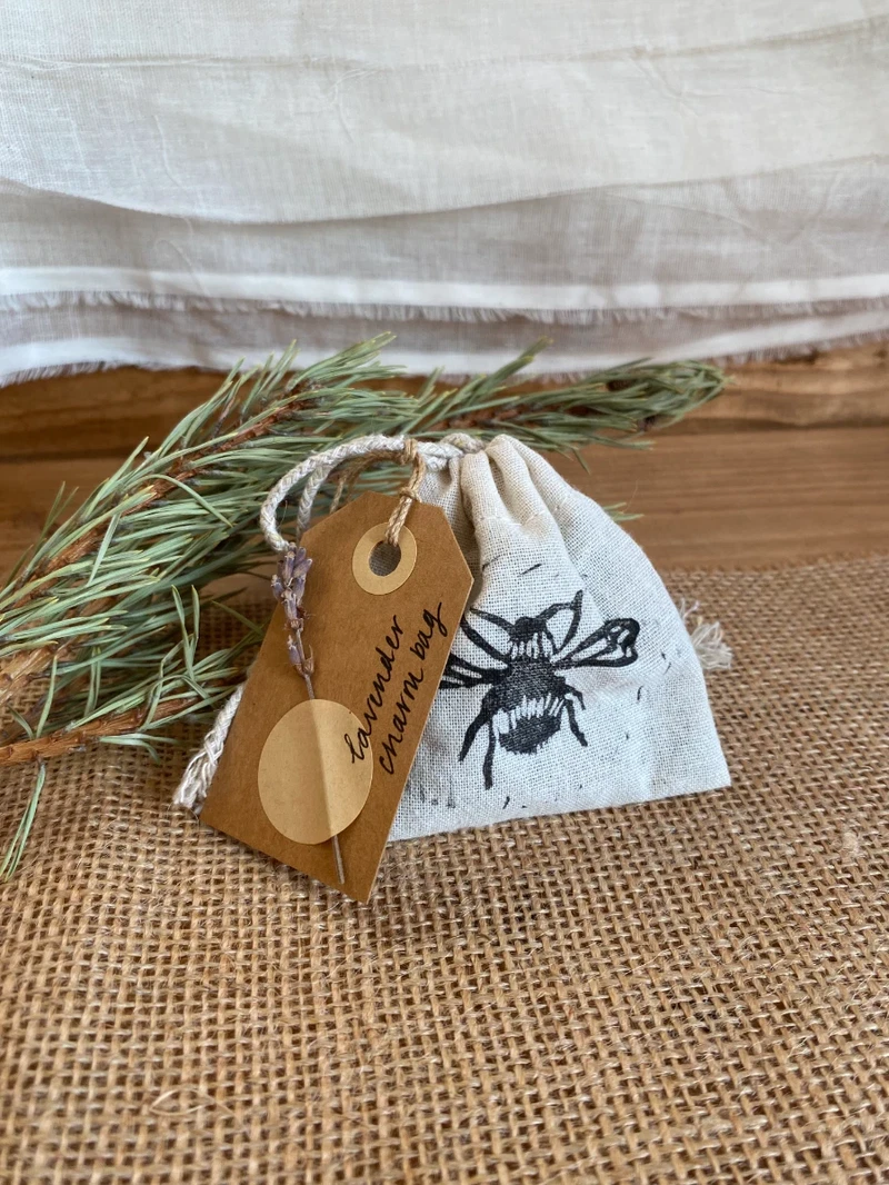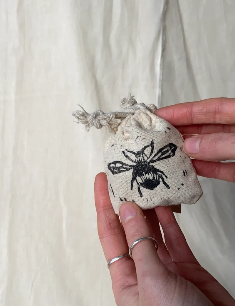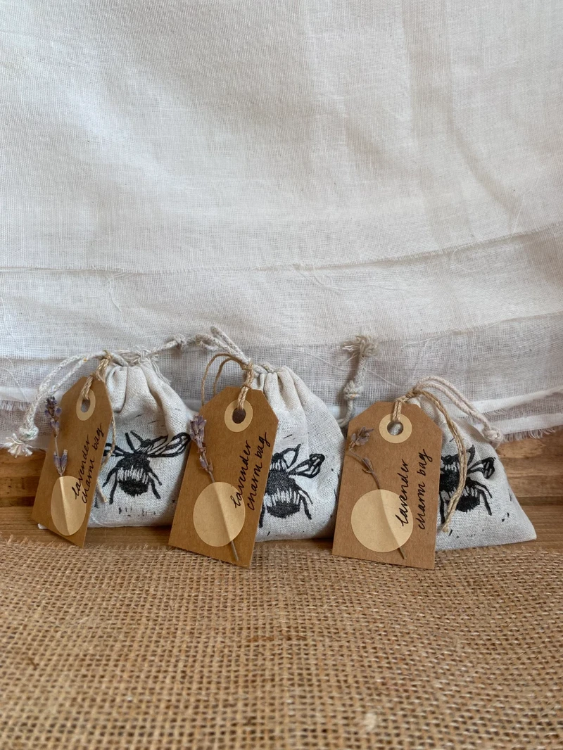 Lavender filled canvas bags with a hand printed lino bumblebee print.