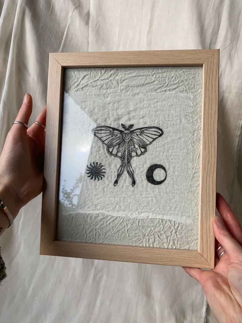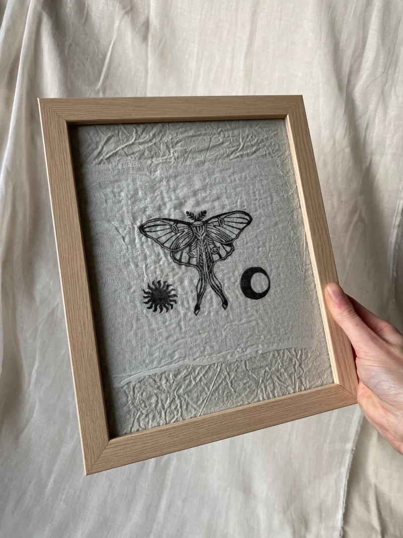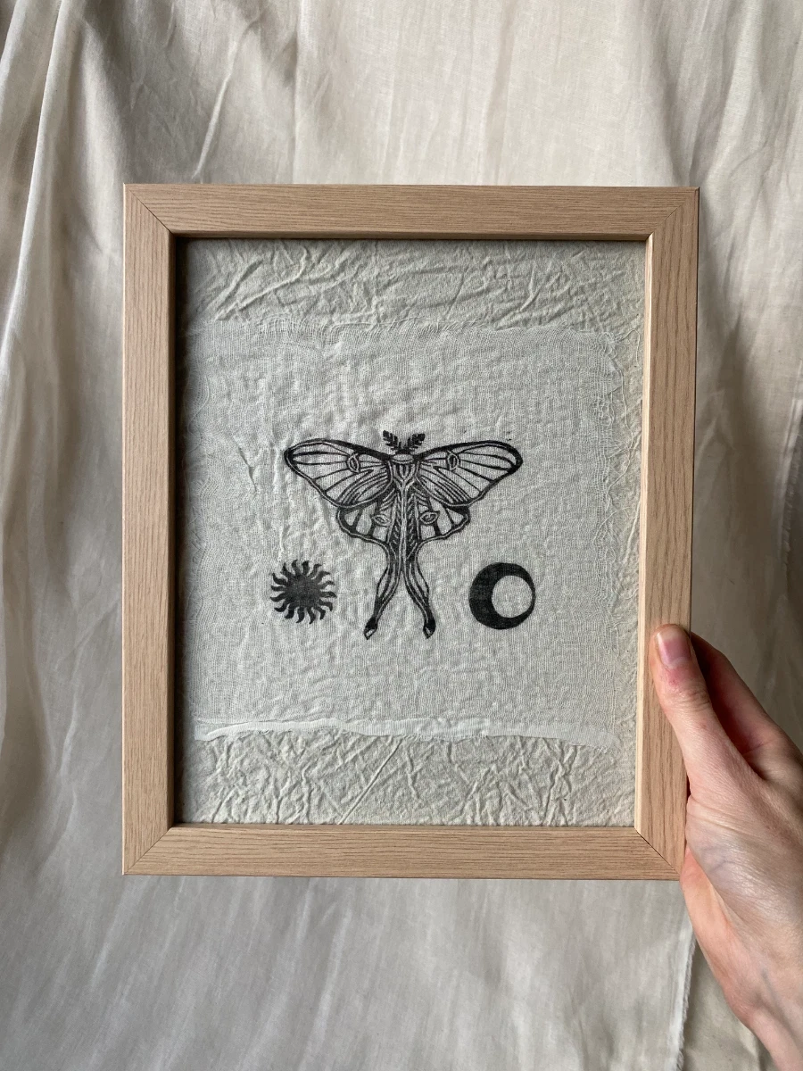 Original lino print on muslin fabric, framed.