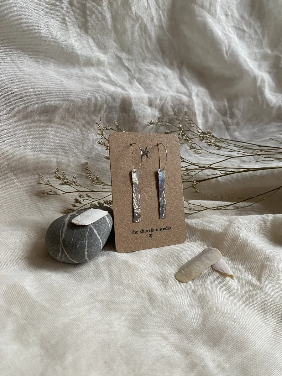 Sterling silver hoop earrings, with finely hammered long and delicate rectangle shapes.