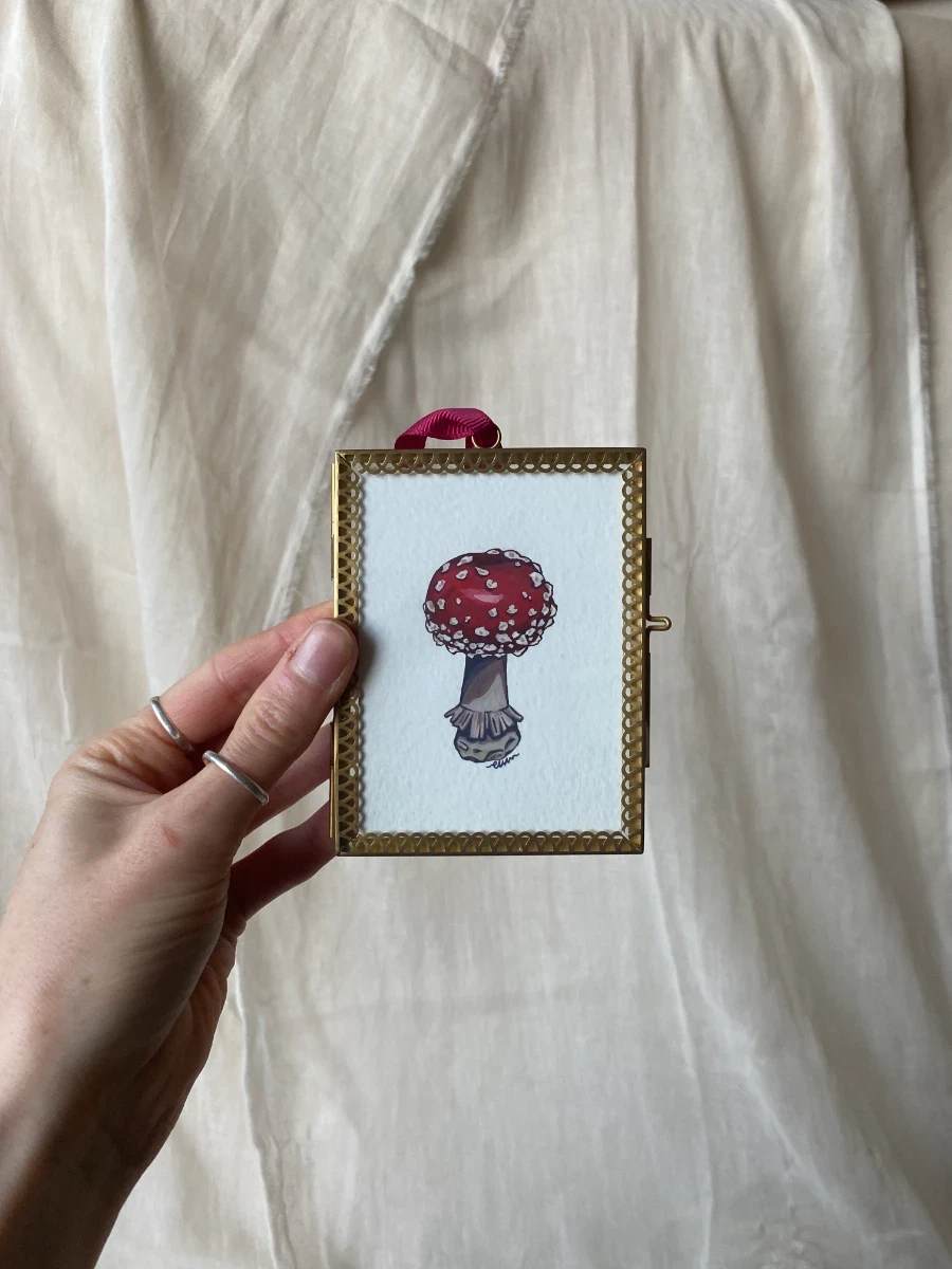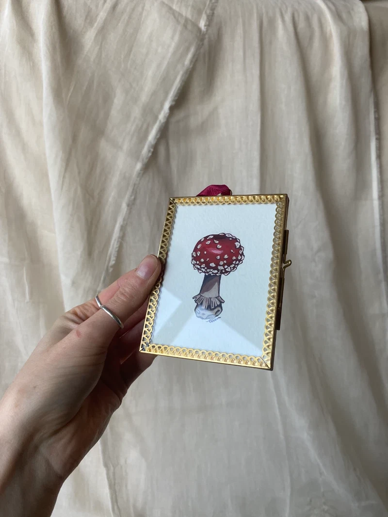 Original gouache mushroom painting framed in a small decorative brass frame.