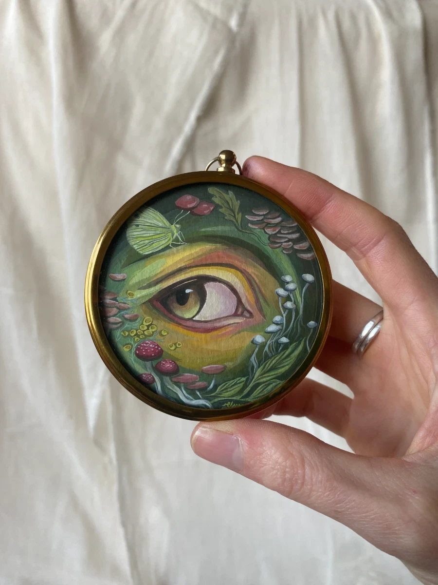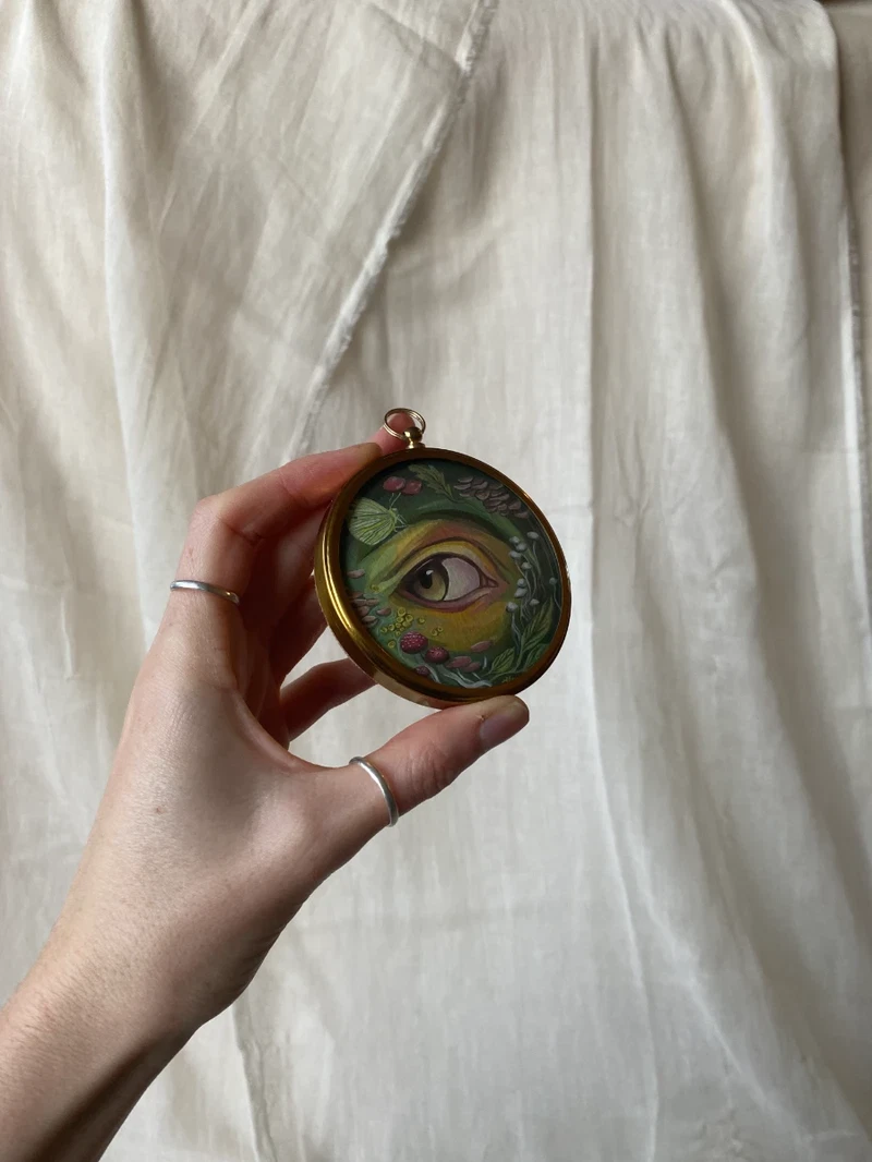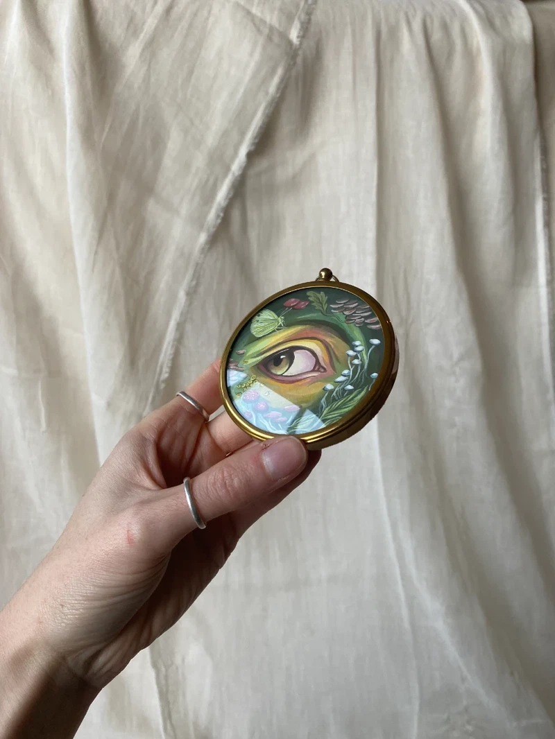 Original gouache green woman painting framed in a small brass circular frame, with velvet backing.