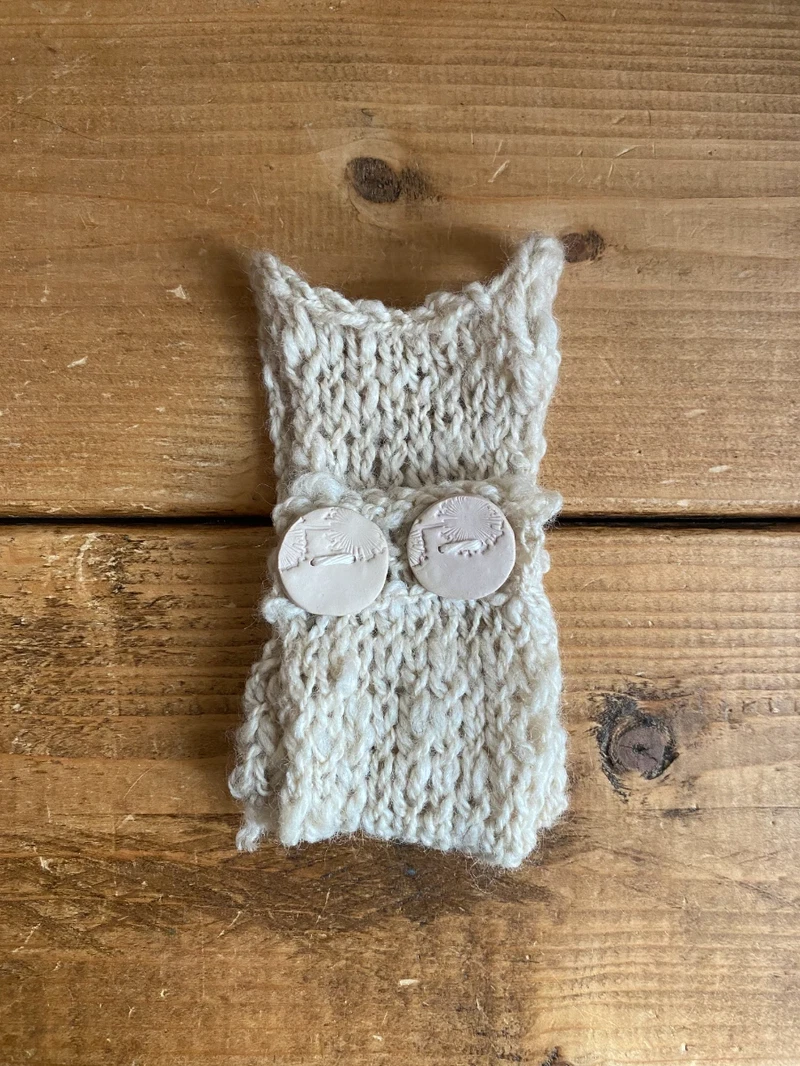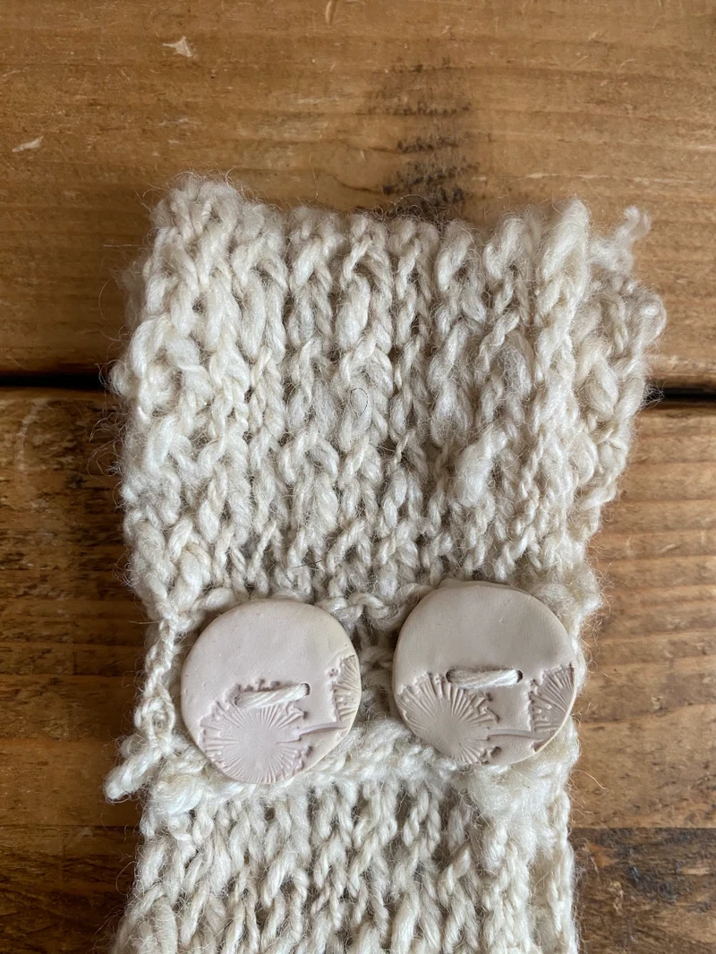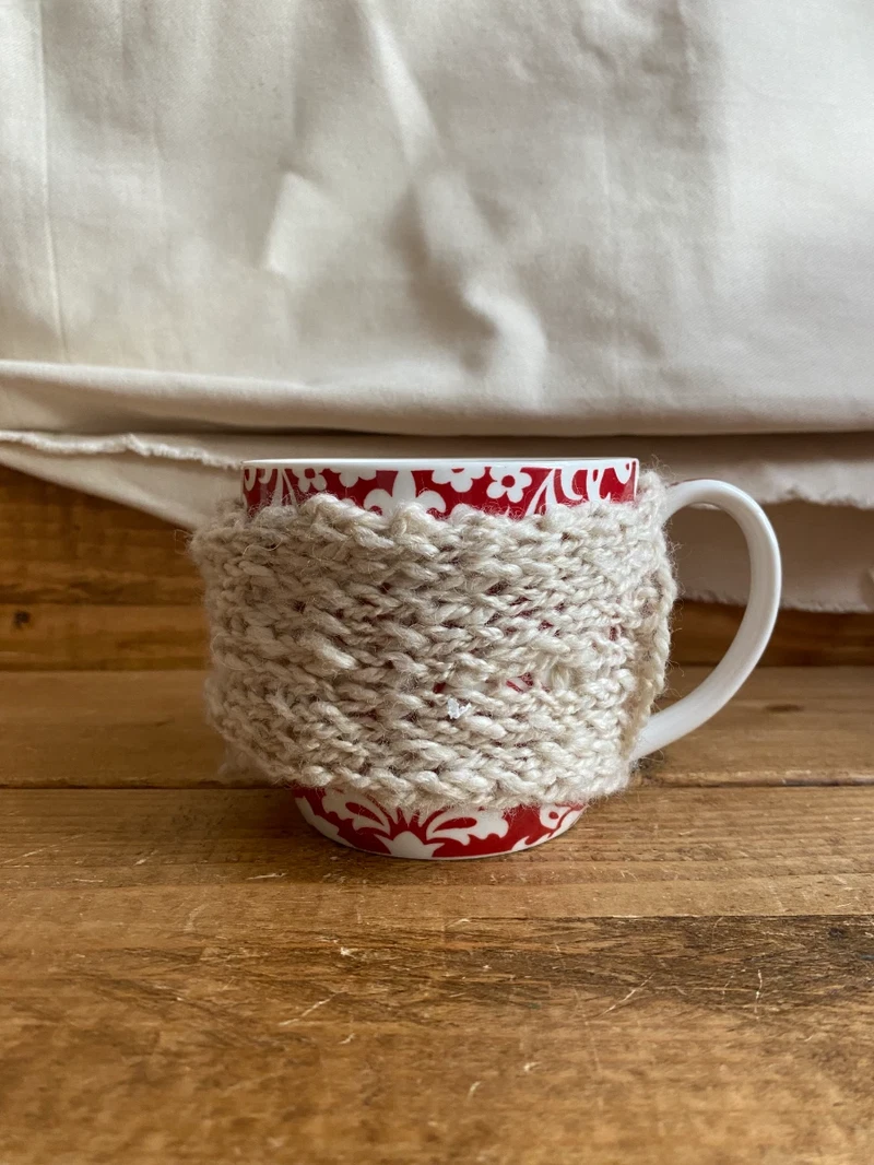 Hand knitted mug cosy using hand spun 100% wool, and handmade polymer clay botanical printed buttons.