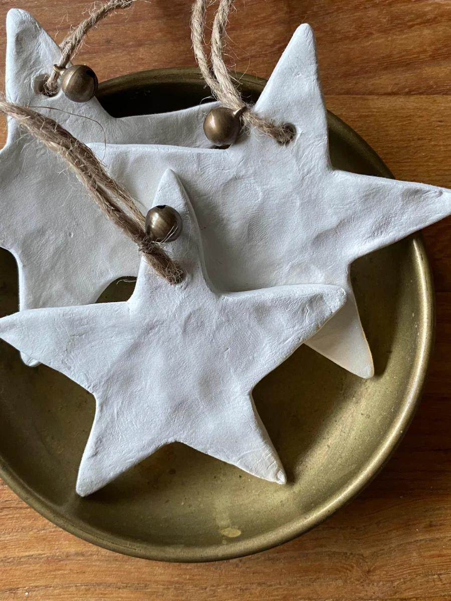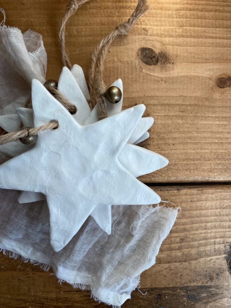 Handmade large clay star ornaments with hung with brown twine and a small brass bell.