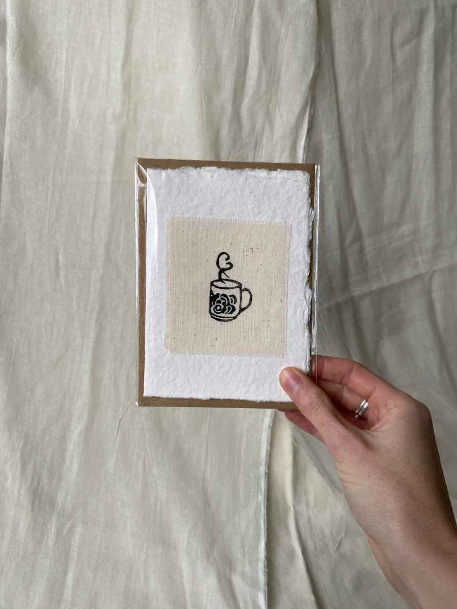 Lino Printed A6 Greetings Cards on Fabric | Cosy Cuppa