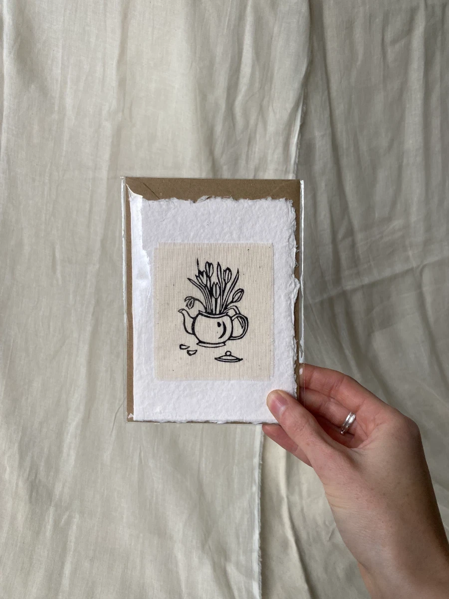 Lino Printed A6 Greetings Cards on Fabric | Tea & Flowers