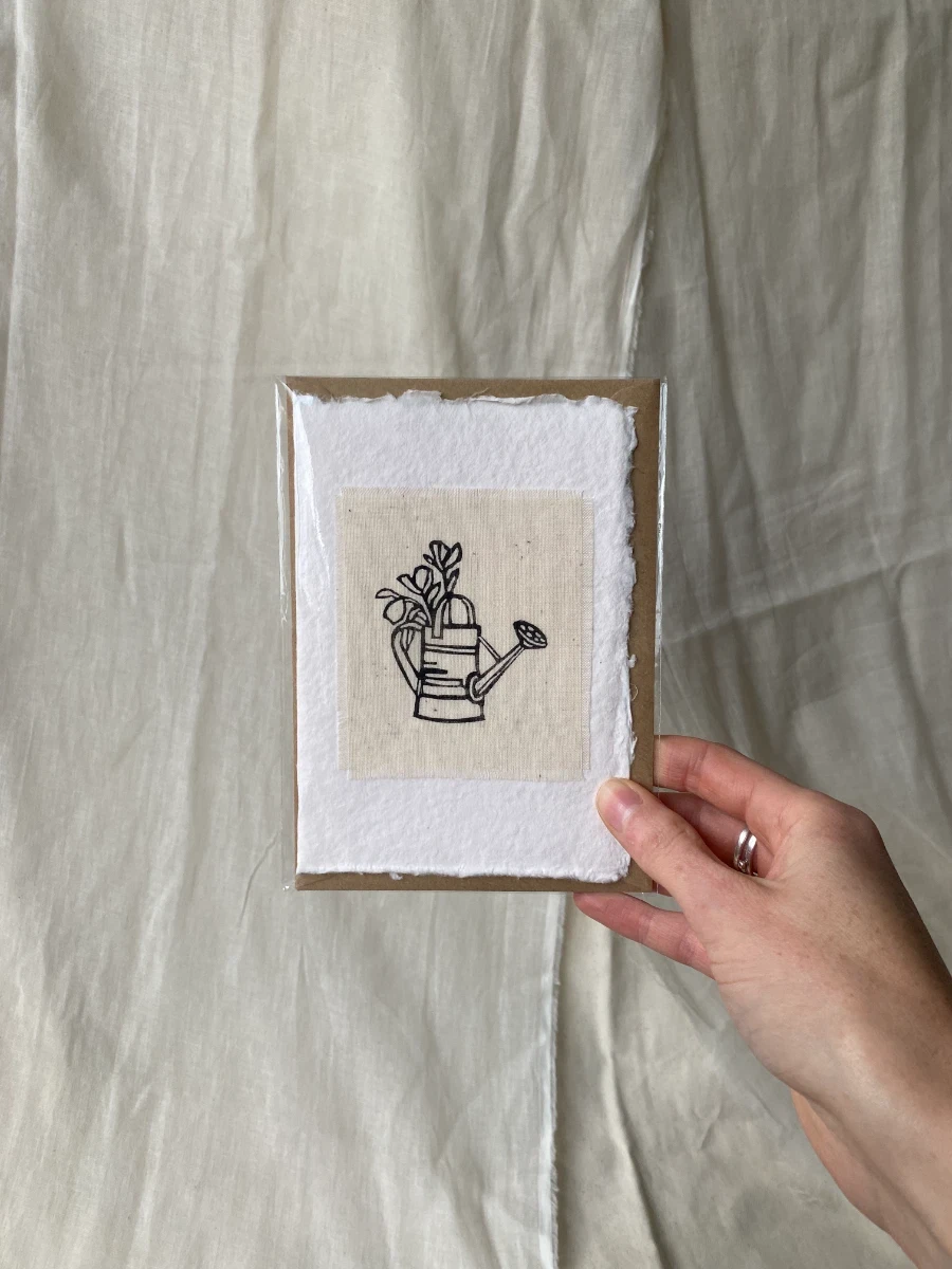 Hand made lino prints on fabric, mounted onto A6 handmade cotton rag paper. Includes brown craft envelope.