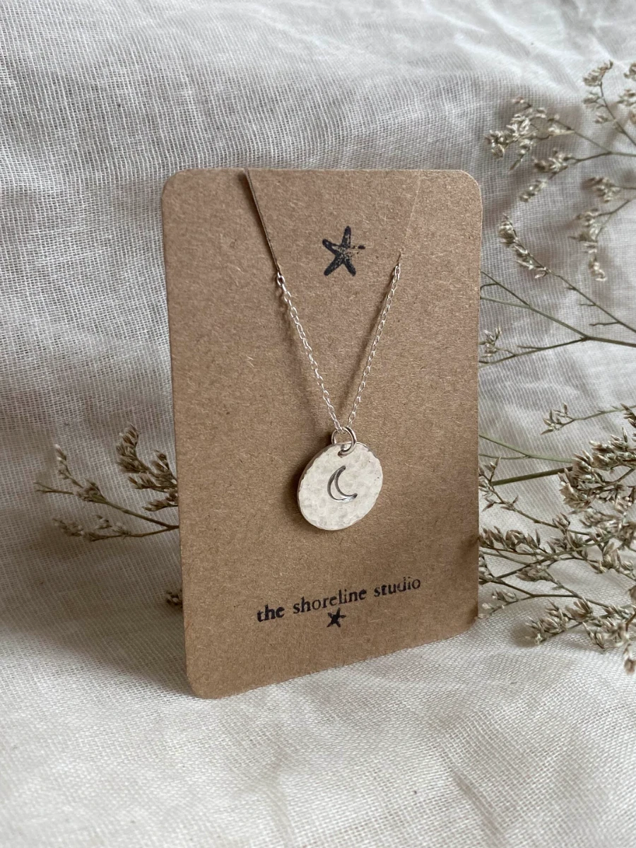 Sterling silver medium coin pendant, hammered and stamped with a crescent moon imprint.