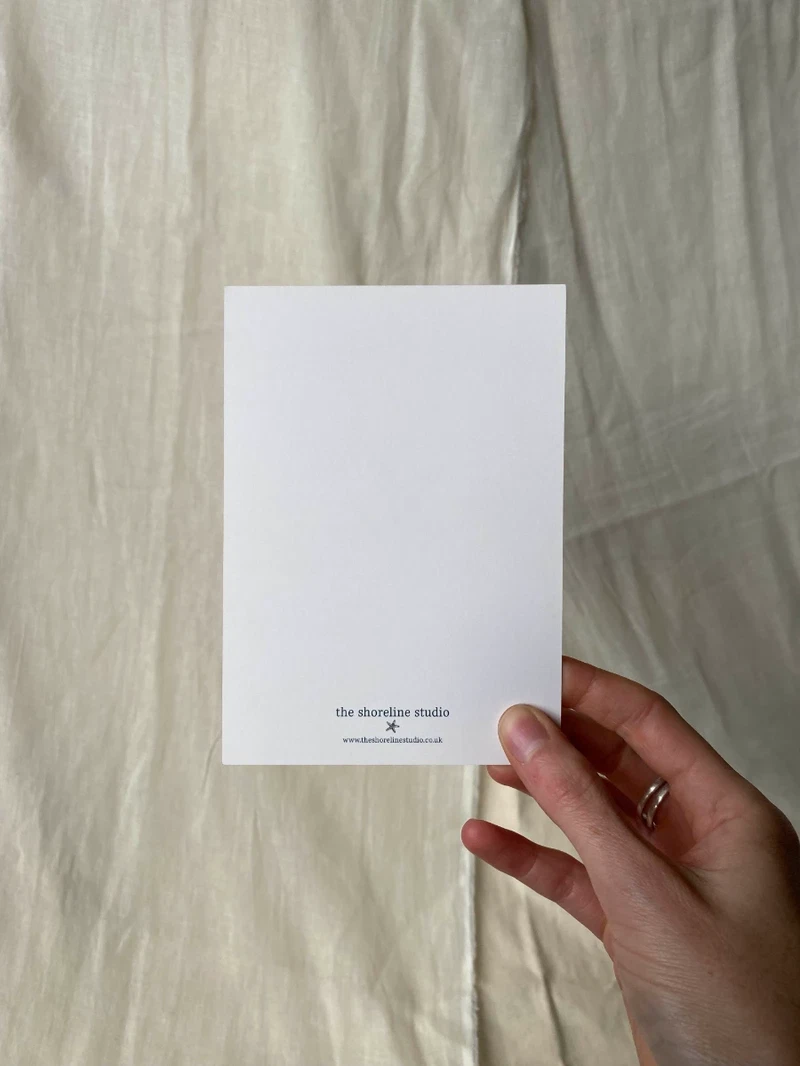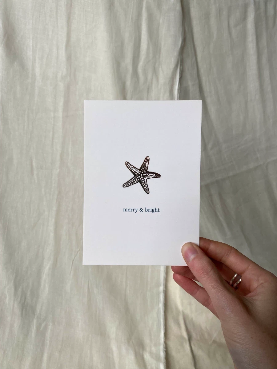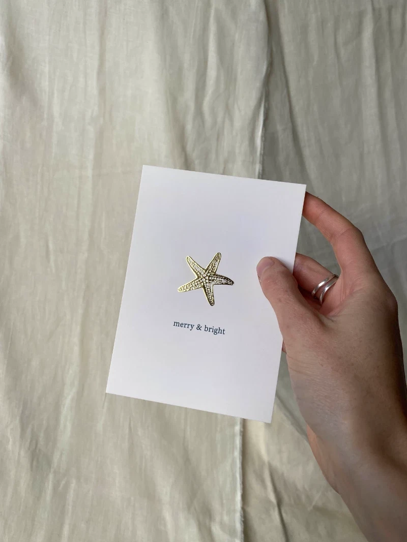 'Merry and Bright' A5 Christmas postcards printed on high quality satin card, featuring a gold shiny starfish design.