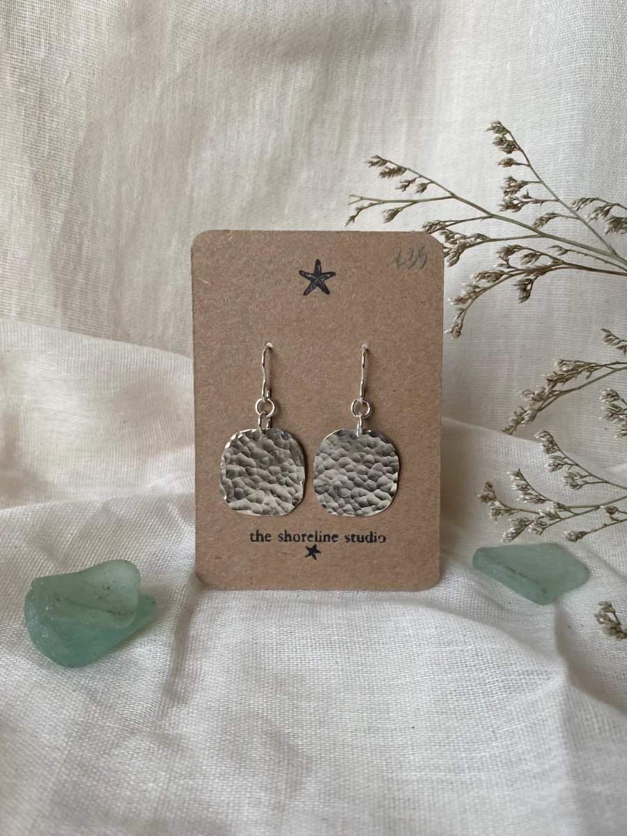 Sterling silver dangle earrings, with hammered and shaped solid circles.