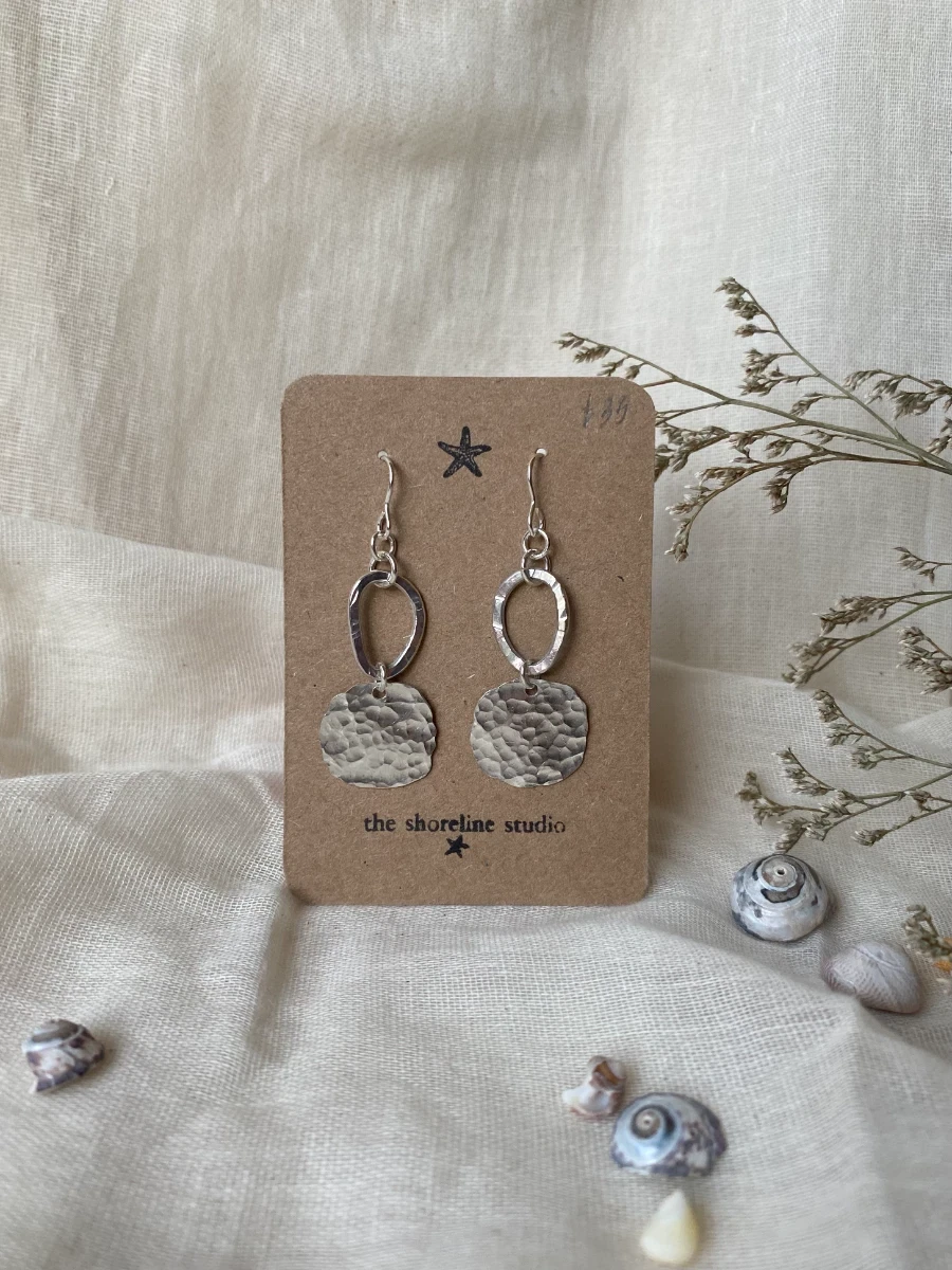 Sterling silver dangle earrings, with double plated hand hammered and shaped solid circles and hoops.