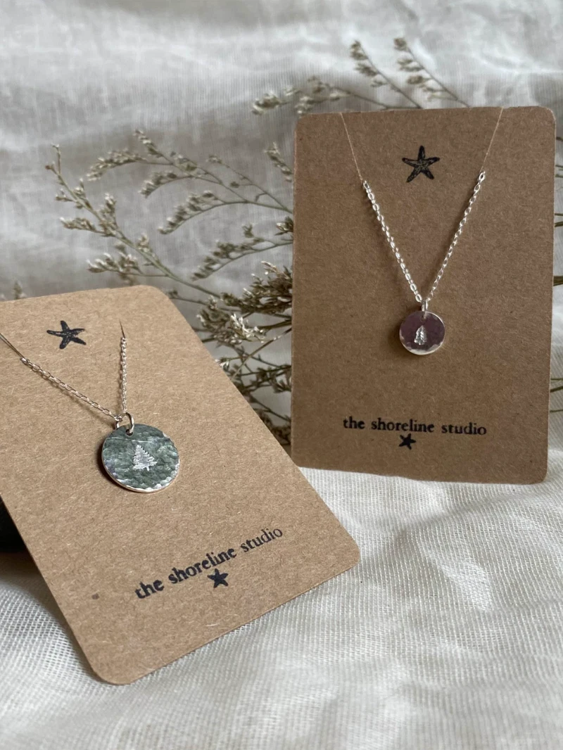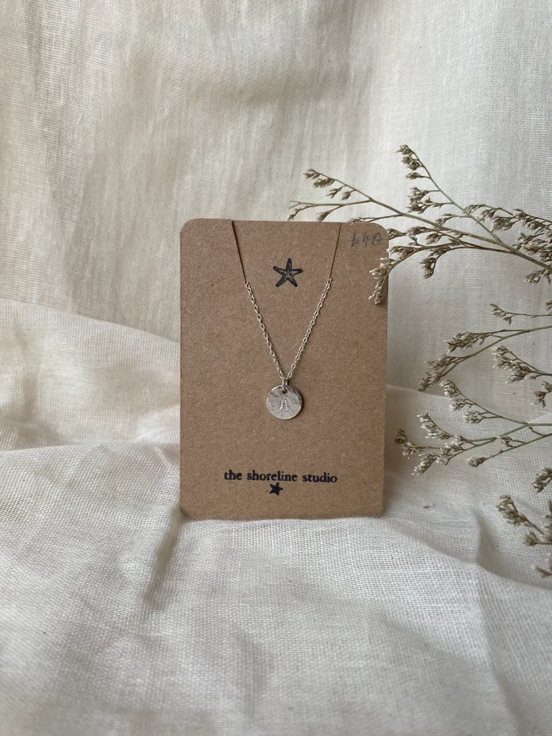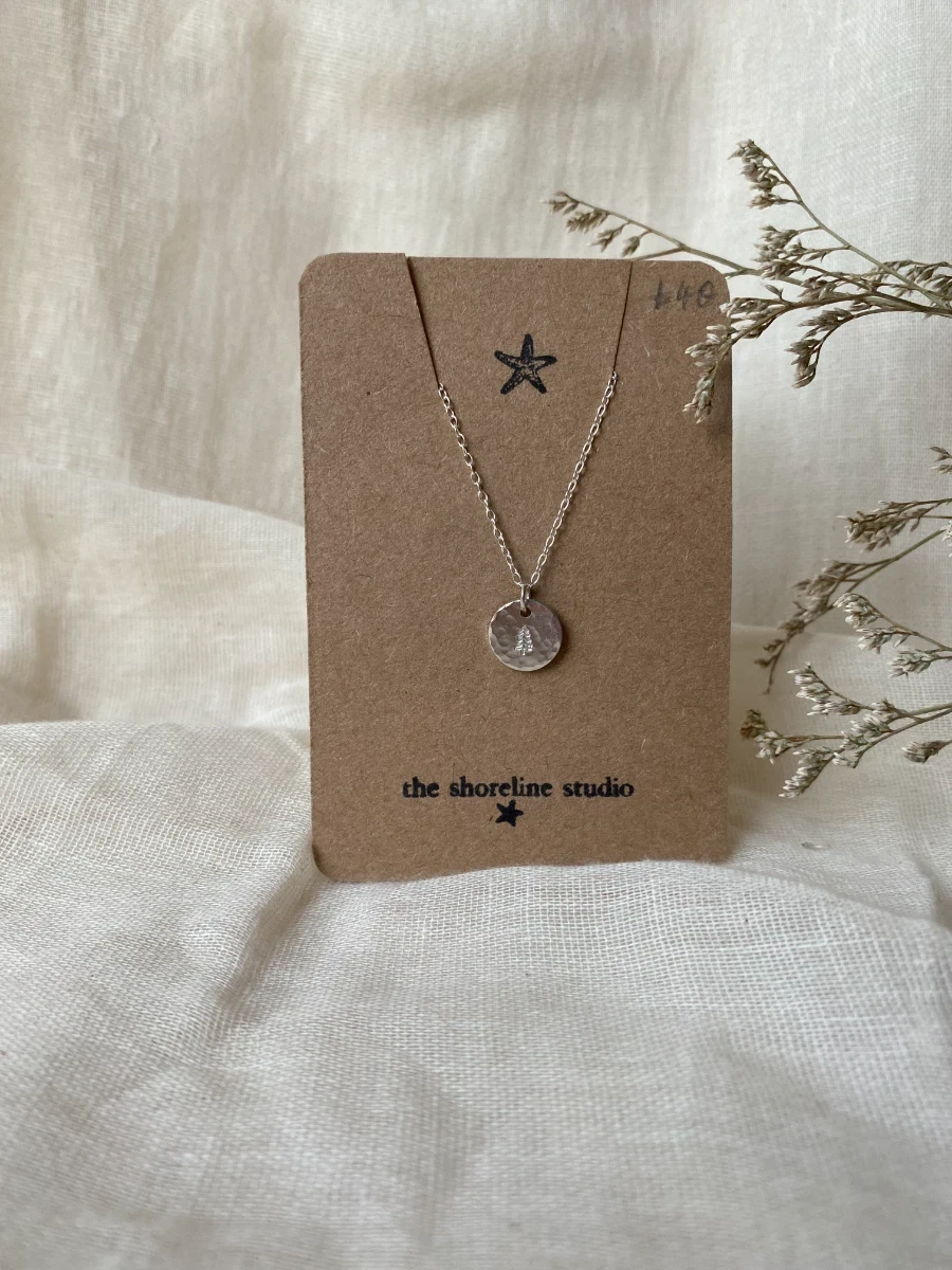 Sterling silver small coin pendant, hammered and stamped with a tree imprint.