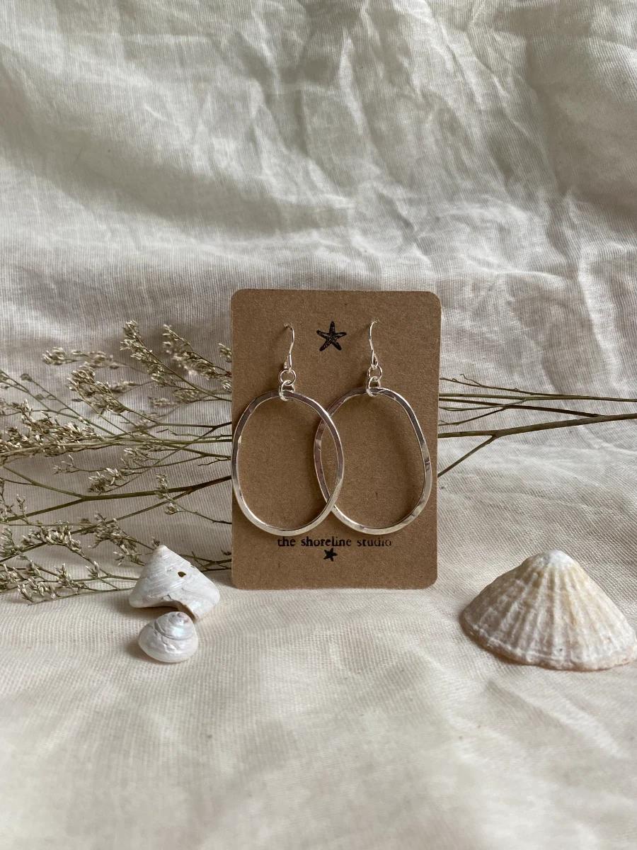 Sterling silver dangle earrings, with large hand hammered and shaped hoops.